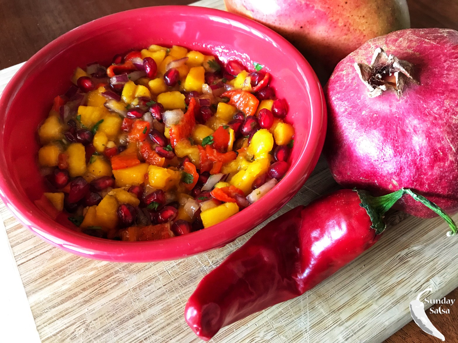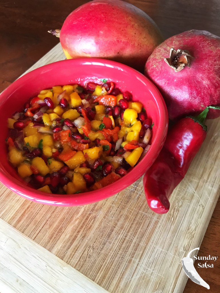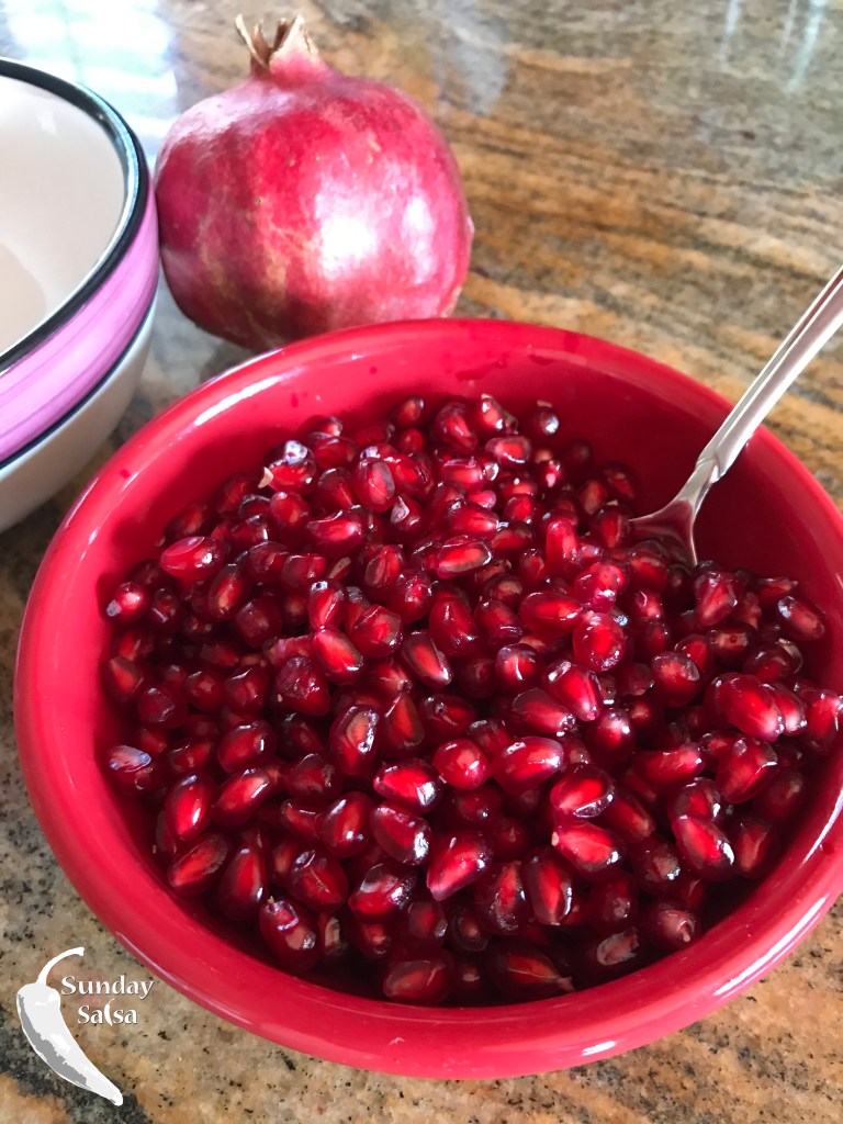 My parents just brought me some pomegranate fruit and I wanted to combine them in some sort of chunky salsa. When I make chunky salsas one of the things I like to also consider is similar or complimenting colors.