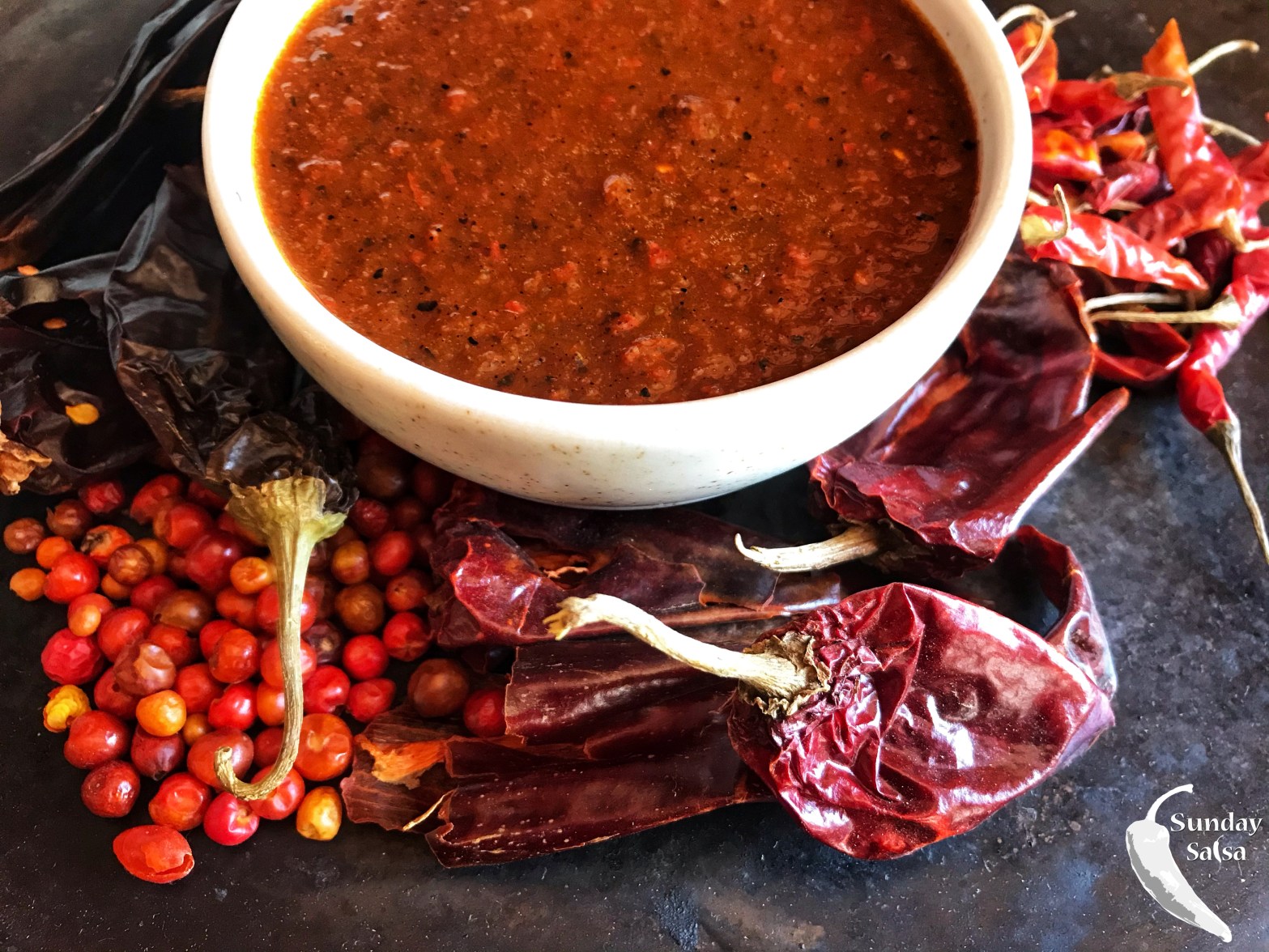 This is my version of Salsa Roja made with three guajillos, three árbols, three New Mexico reds, and a few chiltepíns. It’s not as spicy as you would think, as its balanced out nicely with cilantro, roasted onions, garlic, a red bell pepper, and ground cloves. This came about because I was out of salsa earlier in the week and decided to use what I had available in my kitchen and garden.