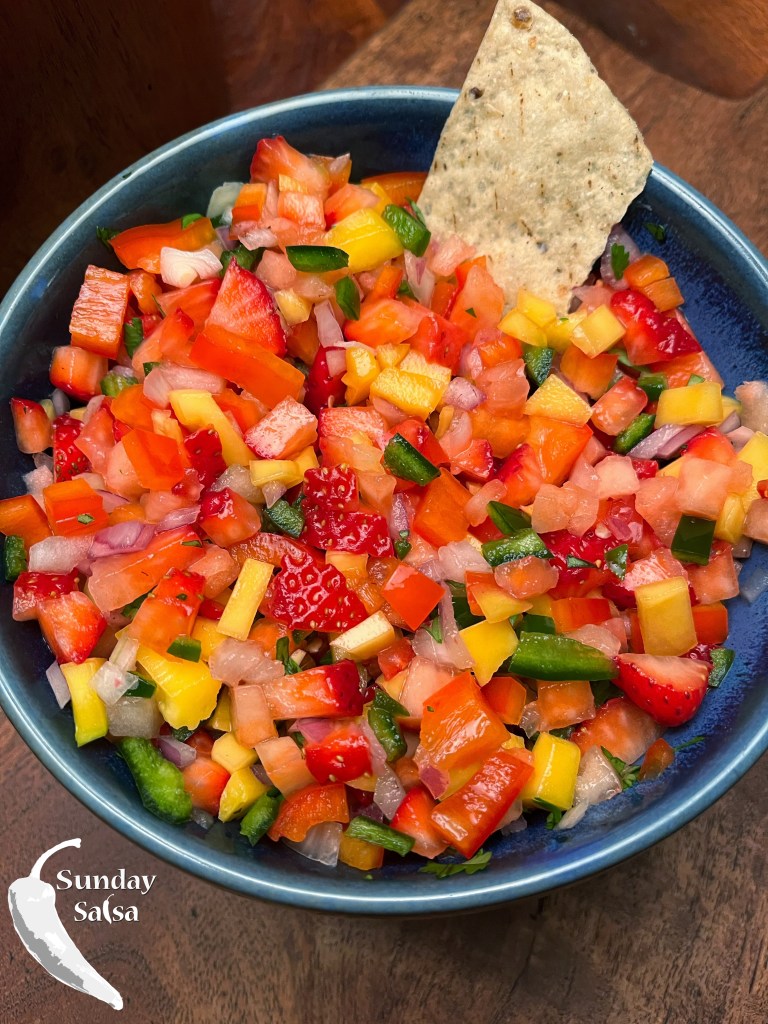 The first strawberry salsa I created was a Pico de Gallo con Fresas. The chunky salsa has a vast blend of flavors. There is a small amount of heat from the jalapeños, two different onions in the salsa, plus cilantro and mango, but the sweet strawberries are what stands out in this dish.