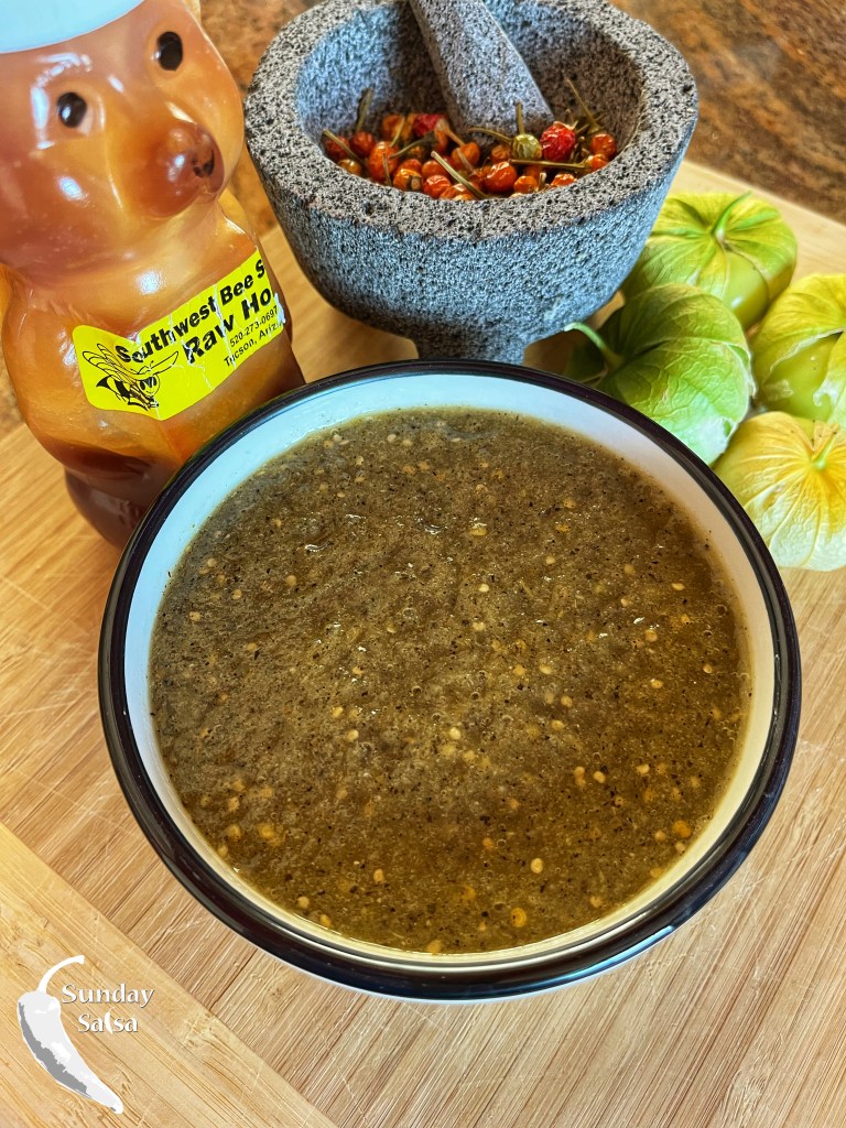 Salsa Cariño is a new creation I made based off my usual tomatillo chiltepín salsa, but increasing the sweetness with the inclusion of honey.