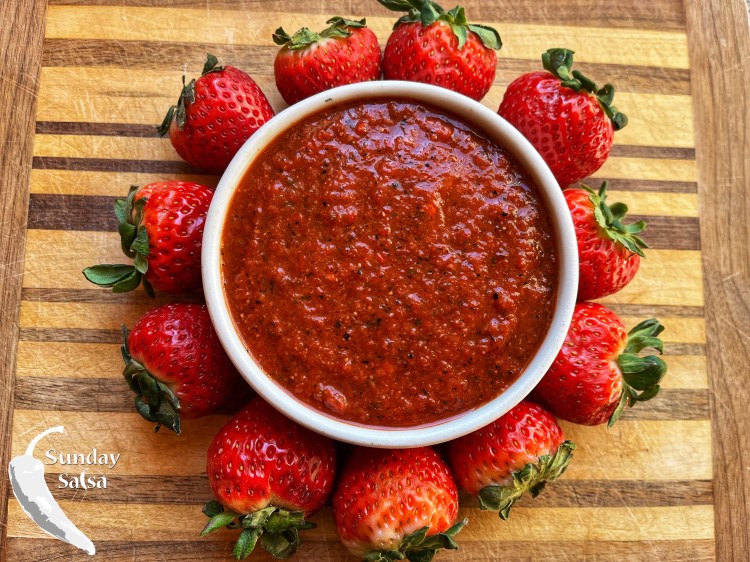 This salsa is not overly sweet, but still has a deliciously rich flavor with a mixture of strawberries, roasted bell peppers, and a Fresno.