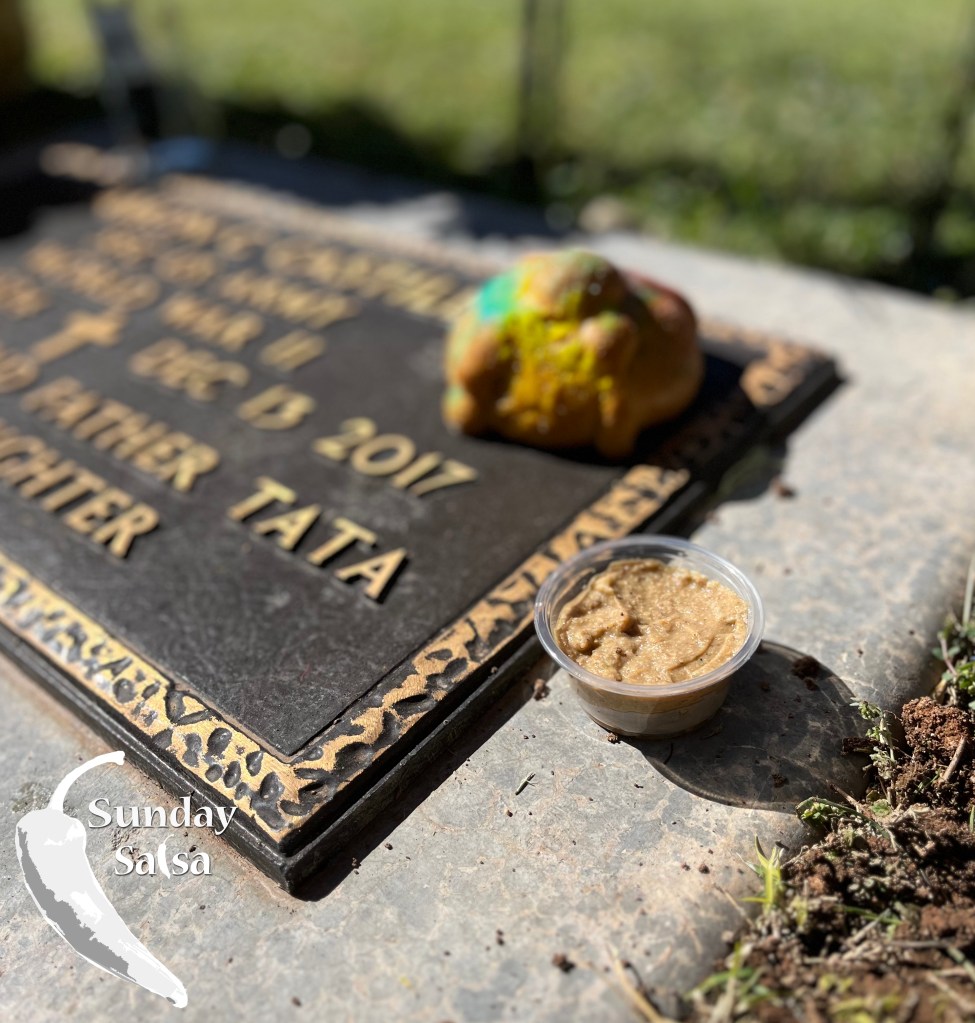 Salsa en recuerdo de mi Nani y Tata blends all these flavors together to form a delicious dish that goes great on grilled chicken, fish, or as a snack with chips. More importantly, it’s an enjoyable way to remember my grandparents and all the fun memories I have of them and their backyard. I left a small container of the salsa at their graves in Douglas this year for them to enjoy on Día de los Muertos.
