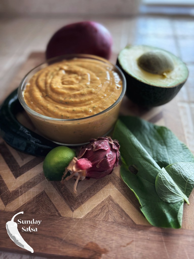 Salsa Tranquilo has a smooth and sweet taste with a mild heat that mixes mangoes, dragon fruit, Crema Centroamericana, chilaca peppers, and reed avocados, which are a California staple. This dish reveals the fun I had while searching a variety of markets for new ingredients during my time by the ocean.